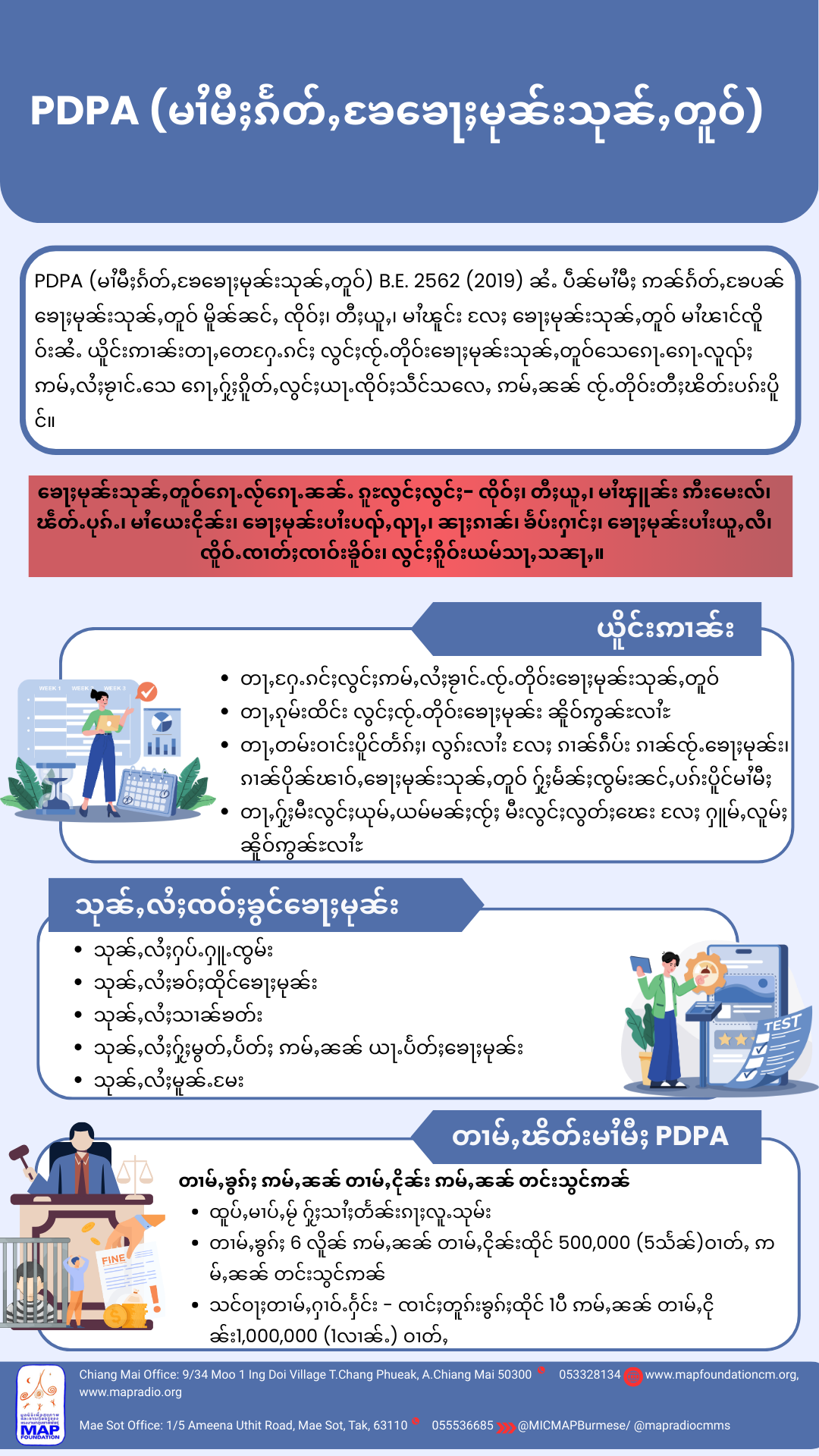 PDPA (မၢႆမီႈၵႅတ်ႇၶႄၶေႃႈမုၼ်းသုၼ်ႇတူဝ်) B.E. 2562 (2019) ၼႆႉ ပဵၼ်မၢႆမီႈ ဢၼ်ၵႅတ်ႇၶႄပၼ် ၶေႃႈမုၼ်းသုၼ်ႇတူဝ် မိူၼ်ၼင်ႇ ၸိုဝ်ႈ၊ တီႈယူႇ၊ မၢႆၽူင်း လႄႈ ၶေႃႈမုၼ်းသုၼ်ႇတူဝ် မၢႆၽၢင်ၸိူဝ်းၼႆႉ ယိူင်းဢၢၼ်းတႃႇတေႁႄႉၵင်ႈ လွင်ႈၸႂ်ႉတိုဝ်းၶေႃႈမုၼ်းသုၼ်ႇတူဝ်သေၵေႃႉၵေႃႉ လူၺ်ႈဢမ်ႇလႆႈၶႂၢင်ႉသေ ၵေႃႇႁႂ်ႈၵိူတ်ႇလွင်ႈယႃႉၸိုဝ်ႈသဵင်သလေႇ ဢမ်ႇၼၼ် ၸႂ်ႉတိုဝ်းတီႈၽိတ်းပၵ်းပိူင်။ ၵွပ်ႈၼၼ်မၢႆမီႈၼႆႉ တႃႇတေထိင်းသိမ်းၵႅတ်ႇၶႄသုၼ်ႇလႆႈသုၼ်ႇပဵၼ် ၵူၼ်းမိူင်း ၼႂ်းၵၢပ်ႈပၢၼ် ဢွၼ်ႇလၢႆးၼႆႉ။